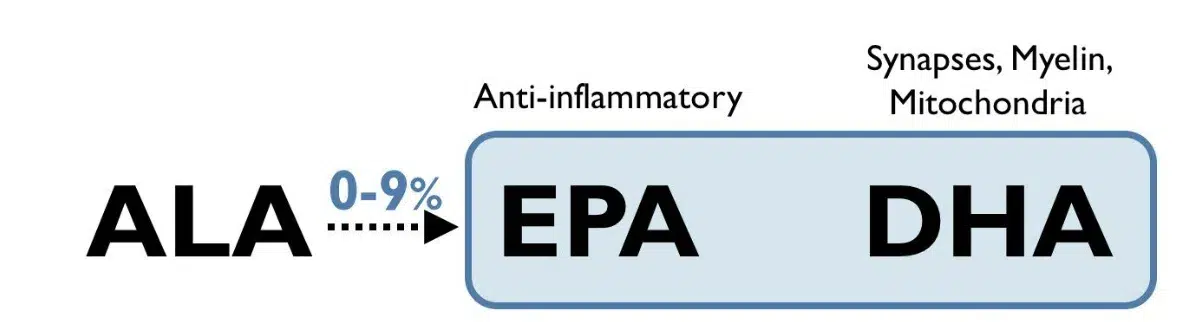 Je lichaam moet ALA eerst omzetten naar EPA en vervolgens naar DHA. En daar zit de zwakke schakel.